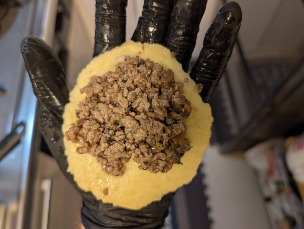 潰したじゃがいもは粗熱を取って(目安:55℃以下)から、溶き卵を少しずつ混ぜ込むと失敗しにくいです。 - 玉ねぎをみじん切りにし、豚ひき肉と塩こしょうを入れて炒め、フィリングを作ります(火を通しておきます)。